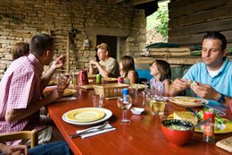 Table d’Hôtes wil zoveel zeggen als ‘Bij ons aan tafel’. We eten samen met de gasten aan een lange tafel, binnen of buiten al naar gelang het weer.